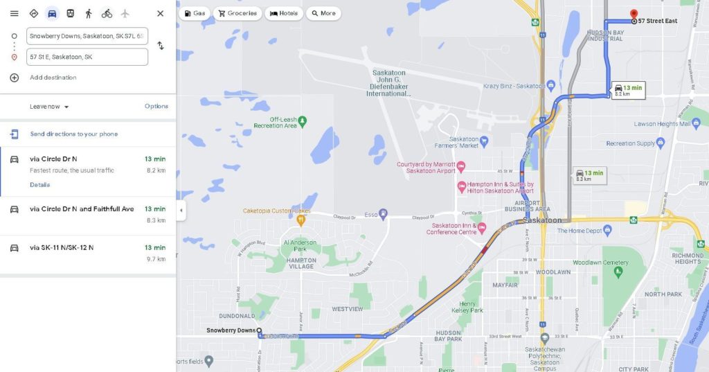 Google Maps: Driving routes from Snowberry Downs to location of Neil Stonechild’s death